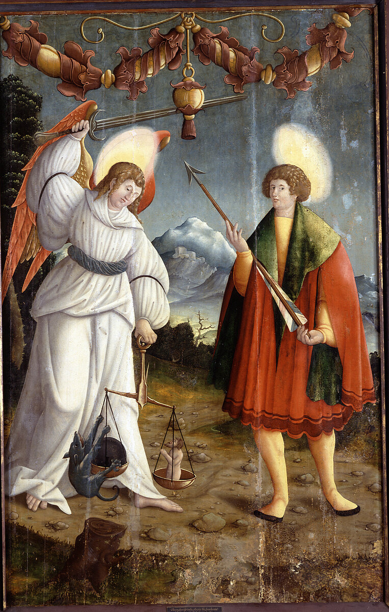 Bez. auf der Fahne des Erzengels (von unten nach oben) AVE (MARIA)GRATIA PLENA D(OMIN)VS TECVM